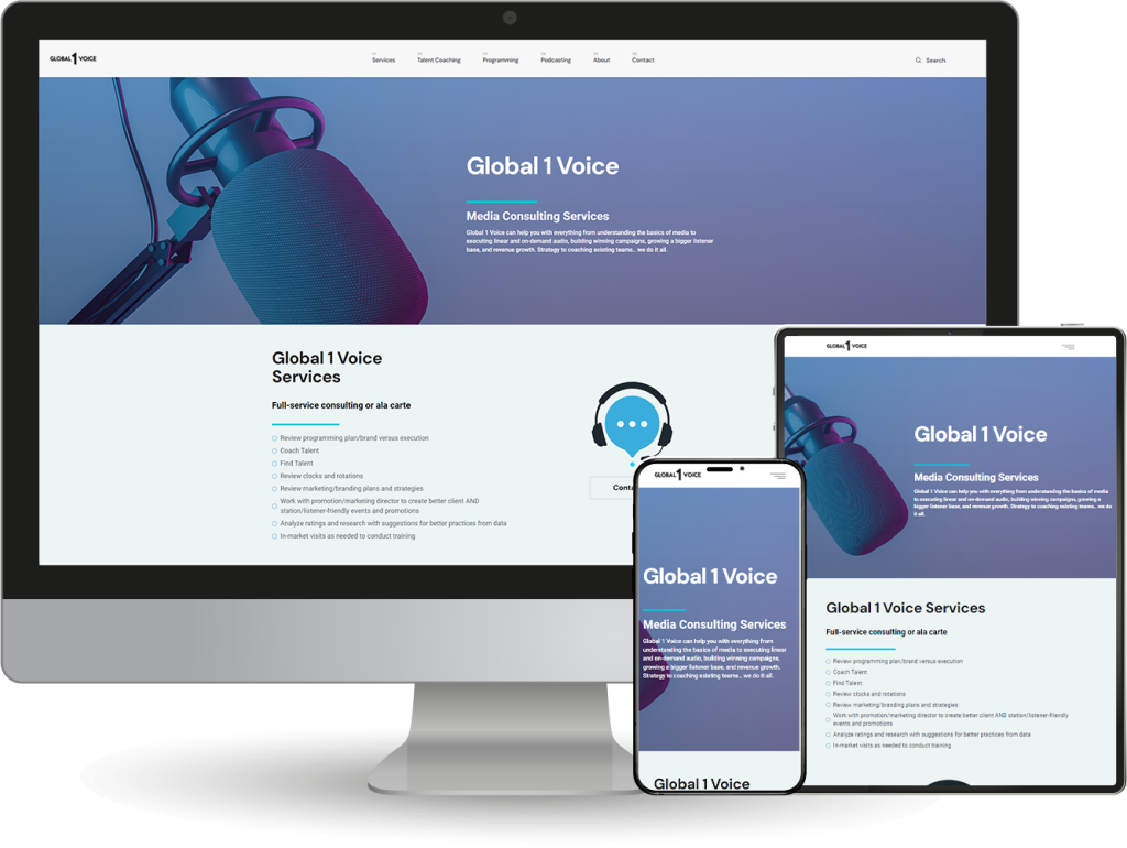 Global 1 Voice approached us with the goal of establishing a powerful online presence that accurately represents their position as media consulting leaders. As specialists in Programming, Podcasting, and Talent Coaching, Global 1 Voice sought a website that not only showcased their technical prowess but also reflected their passion for empowering media professionals and fostering creative excellence.